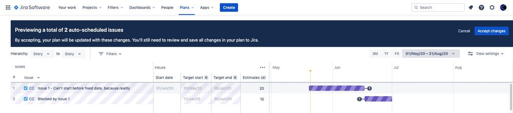 Example: a plan with just two tasks. Make the first one block the 2nd. (Awesome ability to specify and visualize this in the Advanced Roadmaps UI - love it!) But the first one cannot start until day X, because the world says so. Perhaps it's an externally-driven deadline, perhaps internal that can't be represented in Jira. Either way, the schedule won't be useful without retaining such a constraint.