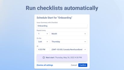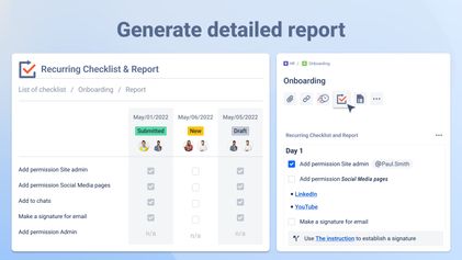 Once you’ve tried Jira’s checklist feature but still feel you’d like your checklists to be more customized for each of your projects, you may try the Recurring Checklists and Report add-on for your repetitive tasks automation. It’ll allow you to create customized checklists for your issues which will become full-fledged guides for your team members and receive one-page reports.