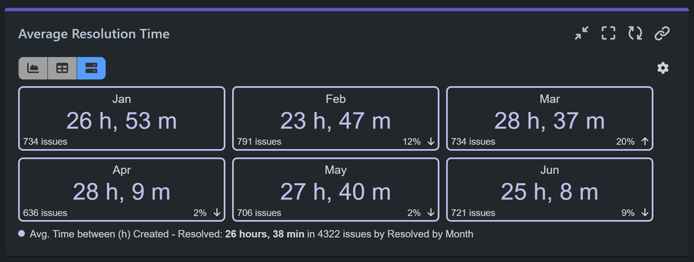 You can create a Resolved vs. Reopened report using Jira Service Management’s native reporting features. Alternatively, the Performance Objectives app offers advanced capabilities for creating this report directly on your dashboard, including extensive data segmentation flexibility and a variety of visualizations for a more comprehensive and customizable analysis.
