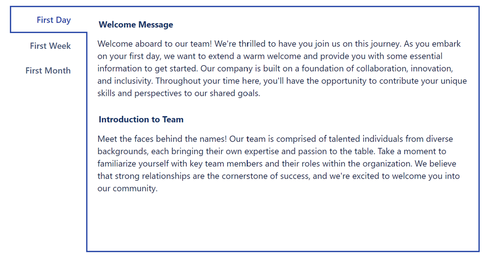 But let’s check a simple scenario. You are a new hire accessing an onboarding plan Confluence page. There is different information to learn and action items to complete within specific timeframes (first day, after a week, and so on.). To make life easier for you, the page would contain several tabs based on those timeframes. So, for example, a week into your onboarding plan, there would be no scrolling or looking around, you just access the tab marked first week.