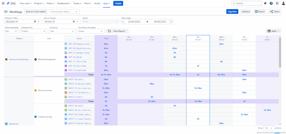 Being aware of how much time you spend on your tasks overall is crucial for gaining an overview of your performance. Worklogs will show you the sum of your logged time. Depending on the filters you choose, the app can display the total time for example for specific issues, issue types, users, or projects. Also, at the bottom of your Worklogs table, there will be a summary - an overview of the total logged time within the given timeframe and filter criteria.