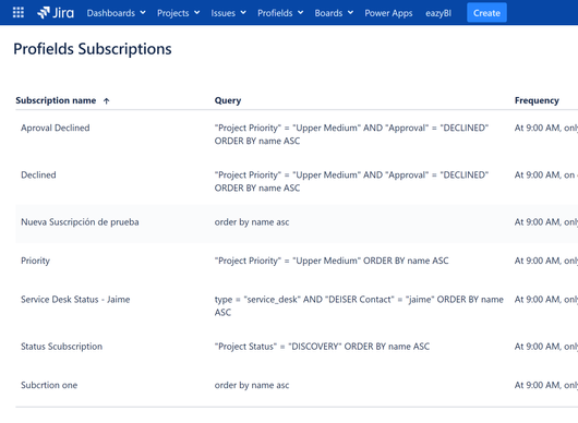 By subscribing the email notifications of Profields, it's possible to configure and save as many subscriptions as you need in order to be updated about your projects in Jira, it is quite simple to customize it, it will be needed to: