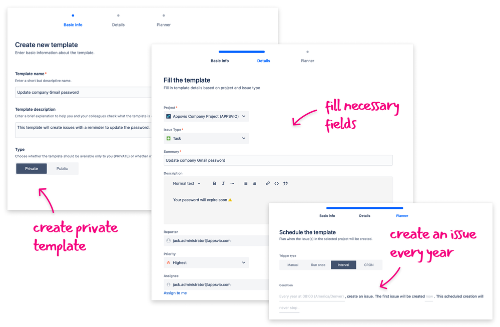 The Scheduled Templates for Jira app allows you to create issue templates and plan their creation in Jira cloud. It is an ideal solution for recurring tasks. Exactly like this with the password expiration reminder! We have created two templates: one private for the administrator and one public for all users.