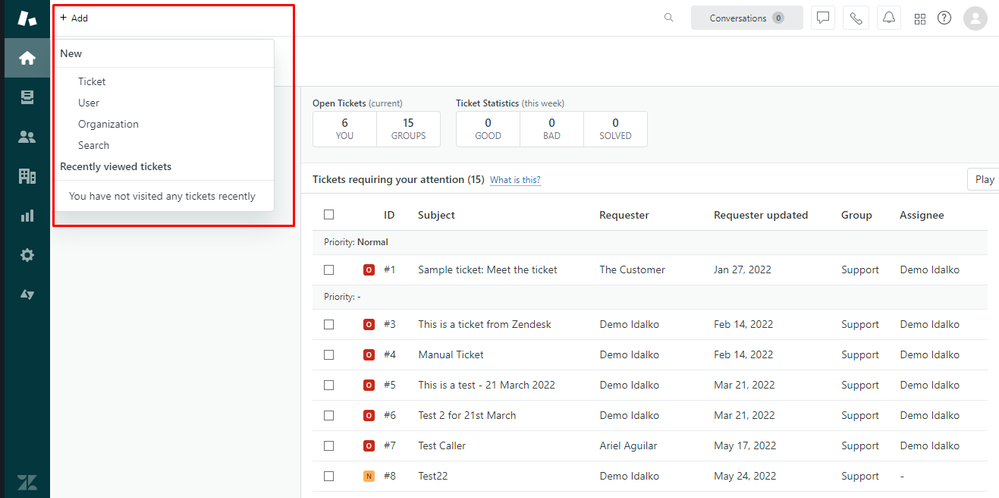 Go to the Zendesk dashboard and click “Add Item” to start. Select “Ticket” from the dropdown menu.