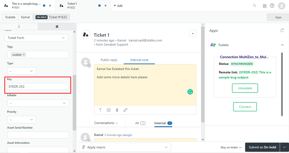 Scroll to the bottom of the ticket and click on “Apply Macro”. Select “Exalate'' from” from the dropdown menu. You will see an internal note showing that the ticket has been Exalated.