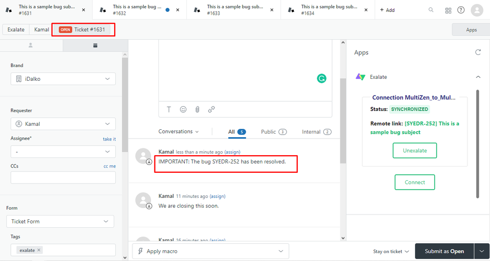 On the Zendesk side, this message will appear as “IMPORTANT: The bug SYEDR-252 has been resolved”. The ticket status will also change from “On-Hold” to “Open”.