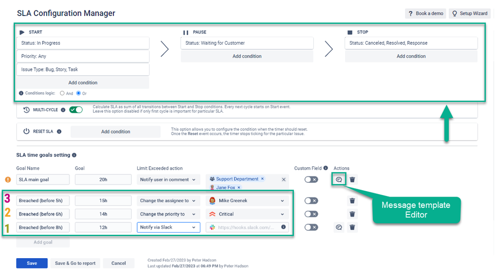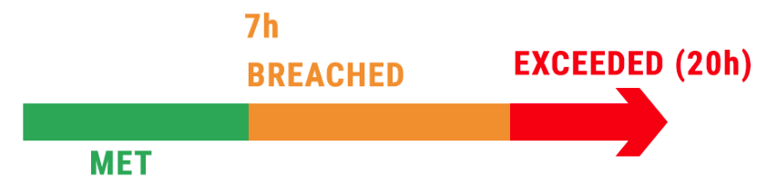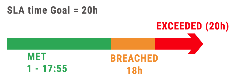 For example, if your SLA goal is 20 hours, the support team must complete the customer's request by that time. After 20 hours, the SLA is breached, and the team has failed to meet the time promised to the customer.