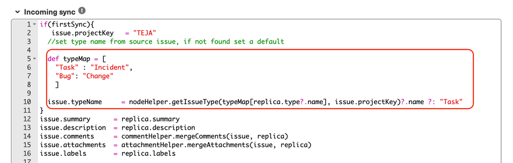 Next, you must map the issue types between the platforms. You can perform this mapping at either of the 'Incoming sync' script windows, depending on your requirement.