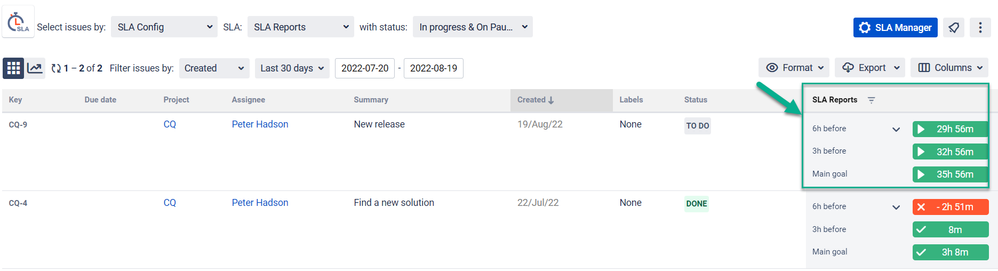 Just install SLA Time and Report for Jira add-on, then go to the Project settings and add “Time stamp” and “Status” labels, and go to the SLA Manager to set up an SLA Configuration. This will allow you to monitor when the tasks are supposed to be completed and understand whether your team is moving according to the plan.