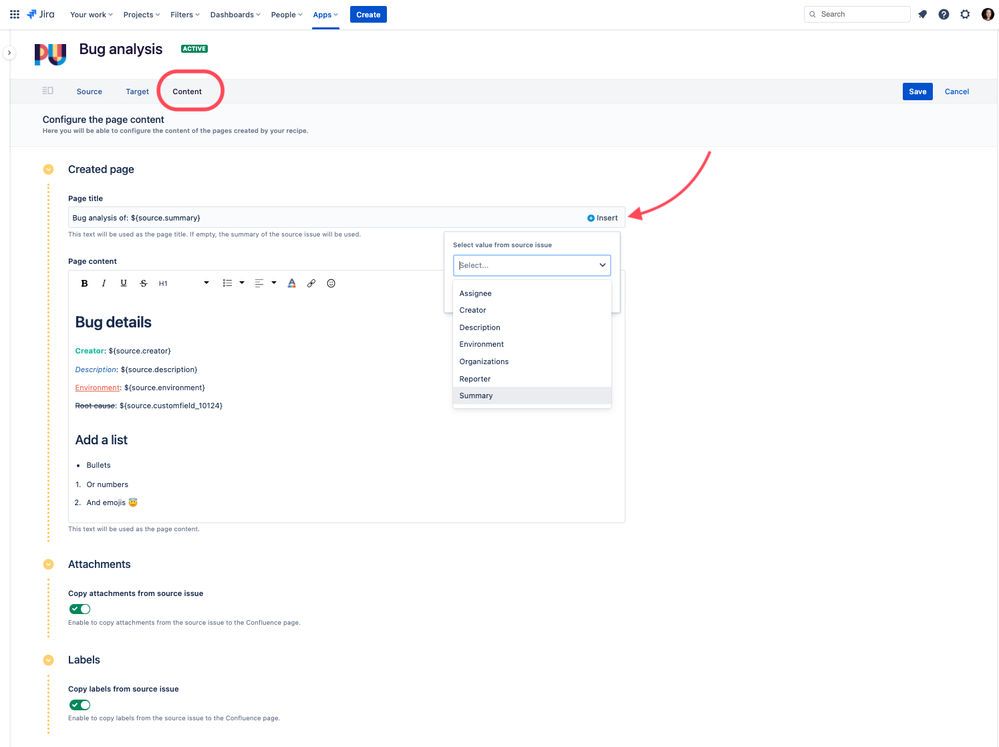 Time to get creative: using the in-app editor, design the page you want to create. You can insert issue details next to static content for both the page title and the page content, add headers (H1, H2, H3, etc), emojis, lists, colors... all with 0 coding š Need labels and attachments from your Jira issue copied to your Confluence page? No problem: just activate the options.