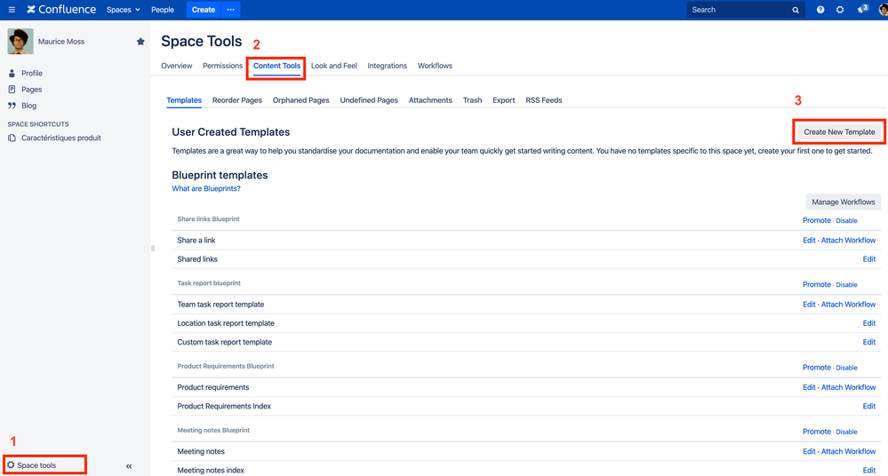 Once the installation is done, let's go to our team space and to Space Tools → Content Tools → Create New Template