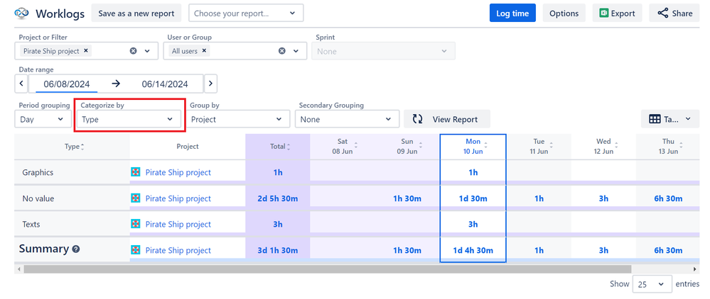 Later on, you will be able to see in Worklogs how much time was spent on them. Choose the particular project and in Categorize by choose your Type custom field: