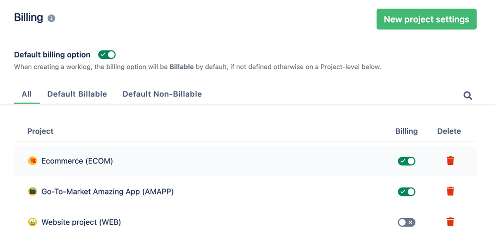 You can turn on/off the default billing option, which allows marking all newly created worklogs with billable (or non-billable marks) as default. It could save time for team members because they don’t need to add this mark every time they log a new effort.