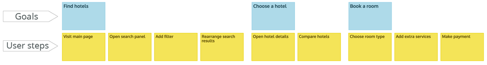 For better understanding the user map journey, what steps does a user take to reach the goal? The basic journey to find hotels could be the following: visit main page -» start a search -» refine results by adding filters (e.g: period) -» rearrange search results (e.g: by price). Collect all steps for each goal. The easiest way to discover the whole journey is following the narrative flow.