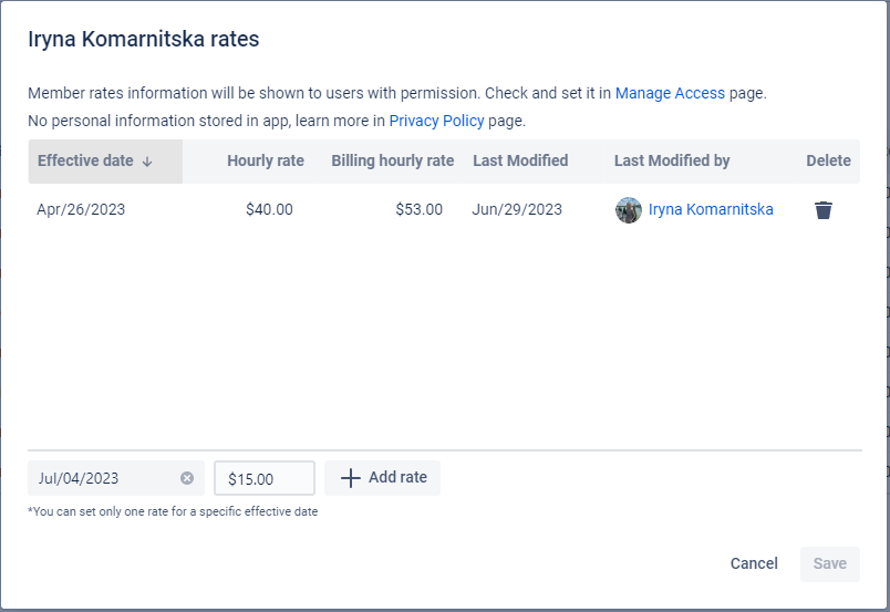 Set Up Hourly Rates: Go to the "Team" tab in Time and Cost Tracker and define hourly rates for each team member. Remember to adjust effective dates for any rate changes that occur during the month.