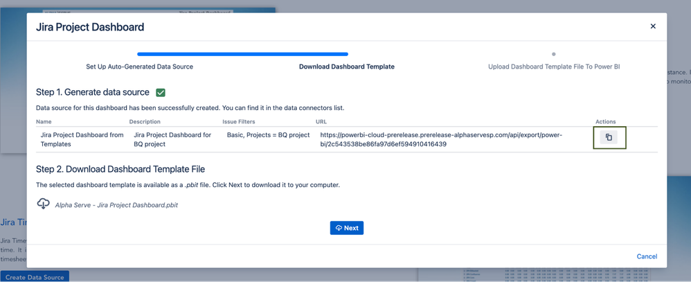 - Copy the generated data source link and click the Next button to download the .pbit file.