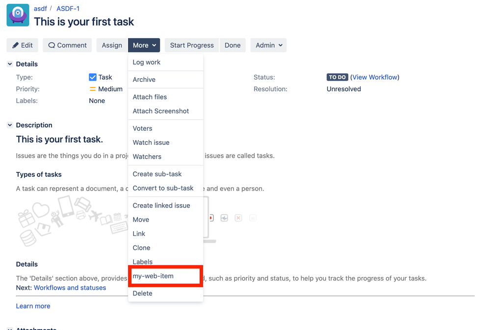 </web-item>This code means that I want to have my-web-item in the view issue screen in the More menu: