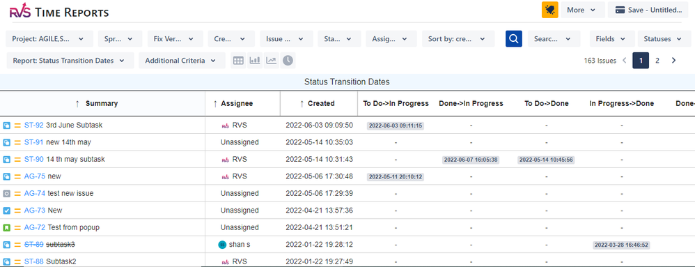 5. Transition Reports: This feature tracks the transition of issues between statuses and assignees. It analyses how tasks move through the workflow, highlights delays or frequently made changes. It gives a detailed report after analyzing the data.