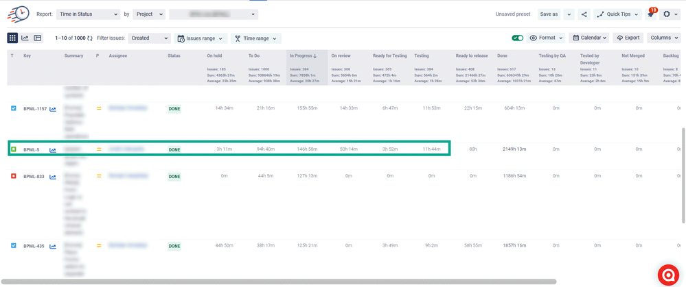 The Time in Status report also helps to identify blockers. Below the screenshot, you can see a task that raises doubts due to the time spent on certain statuses. Is it easy to implement? It could be stuck because it's too large and requires breaking it into even more sub-tasks. Or do you need to attract additional resources to solve it?
