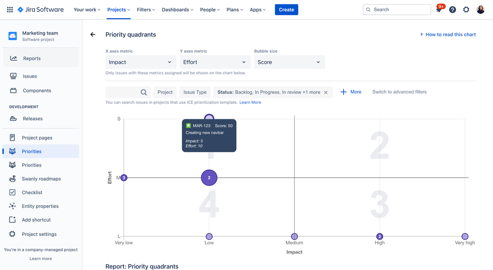 You can also visualize priorities on the Priority matrix. Use Impact on Horizontal and Ease on vertical axes to get a good understanding of what are the quick wins or the ones that don’t bring that much value and are very difficult to do.