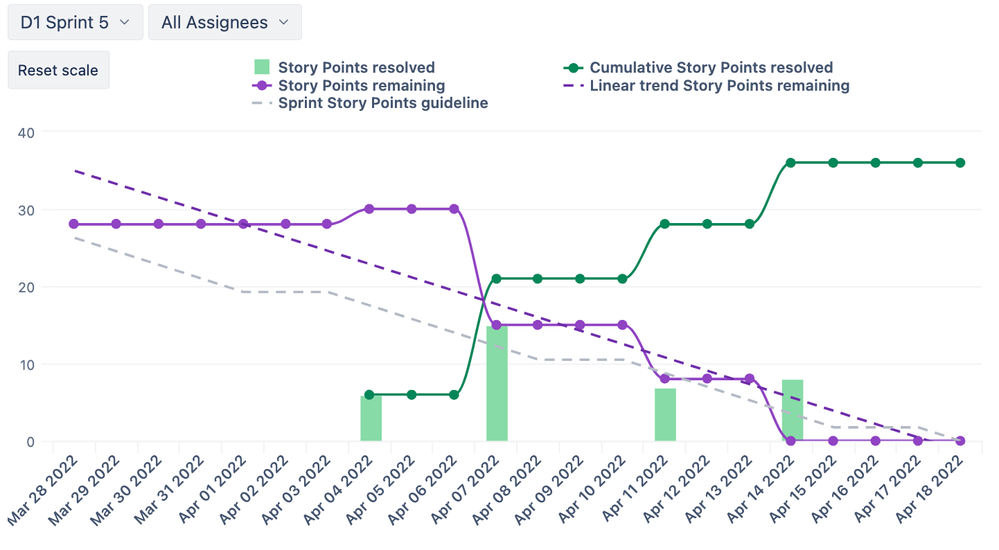 This report shows the current trend and optimal burn-down guideline as well as resolved and remaining story points per selected sprint. You can track the total work remaining and forecast the likelihood of achieving the sprint goal.