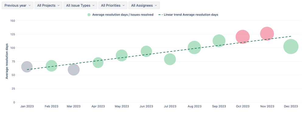 The chart shows the number of issues resolved (bubble size) over time (x-axis) based on the issue resolution date, with certain average resolution days (y-axis) showing a linear trend of average resolution days over time. Using conditional formatting, bubbles representing higher and lower average resolution days are colored.