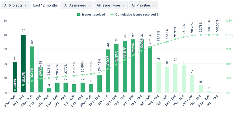 The lead time distribution report shows how many issues were resolved within specific time intervals. The cumulative progression of resolved issues (in %) predicts the probability of resolving issues within a particular time interval.