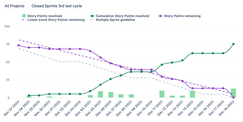 This chart tracks progress in multiple sprints based on resolved story points. It is mostly useful if the work is realized in several parallel sprints.