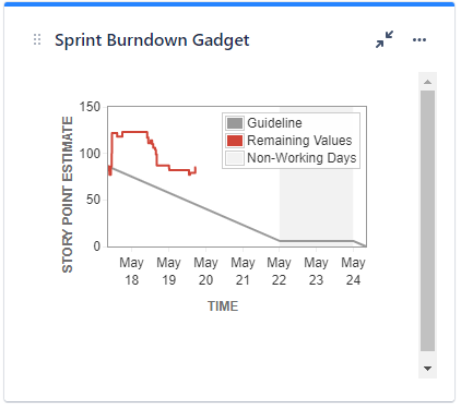 The gadget provides you with a “guideline” based on the total estimated issues. It’s presented by the grey line. “Remaining values'' equals the actual work done. It’s the red line, which ideally would be under the grey line. If the red one is higher than the guideline, the project is likely to be behind schedule.