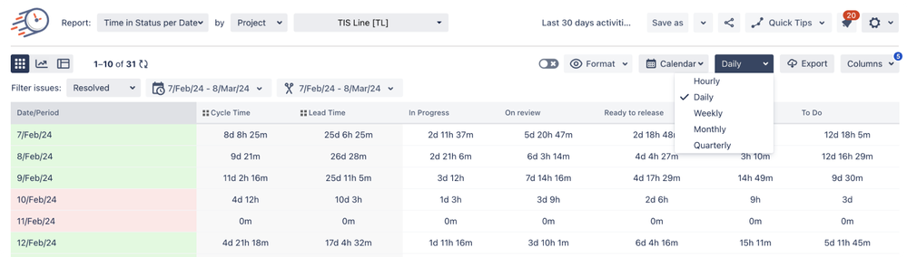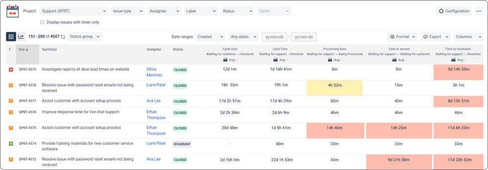 This tool allows you to generate seven types of reports designed to comprehensively analyze the Time in Status metric (Time in Status, Assignee Time, Average Time, Status Entrance Date, Status Count, Transition Count, Time in Status per Date).