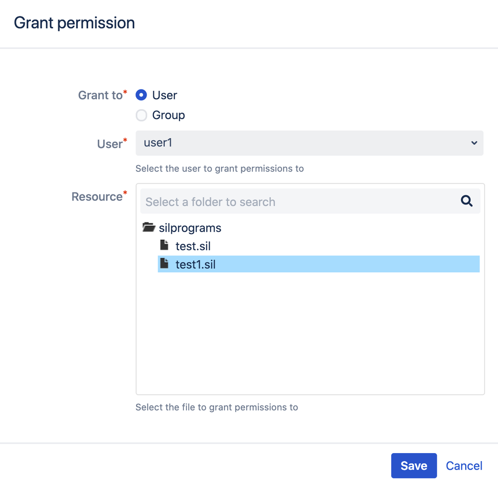 And we get the 403 Forbidden error. Now let's permit user1 to execute the test1.sil file, push the Grant execute button: