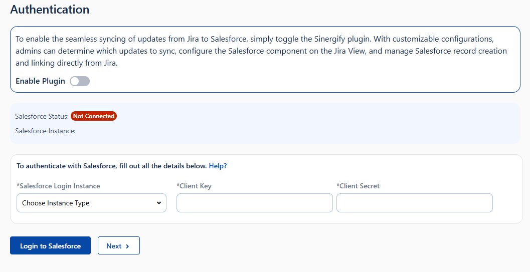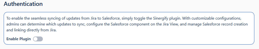 Option to 'Enable or Disable the Plugin' Sinergify plugin allows updates to sync from Jira to Salesforce. With configurations, the admin can decide what updates to be synced from Jira to Salesforce, configure the Salesforce component on Jira View, Salesforce record creation and linking from Jira.