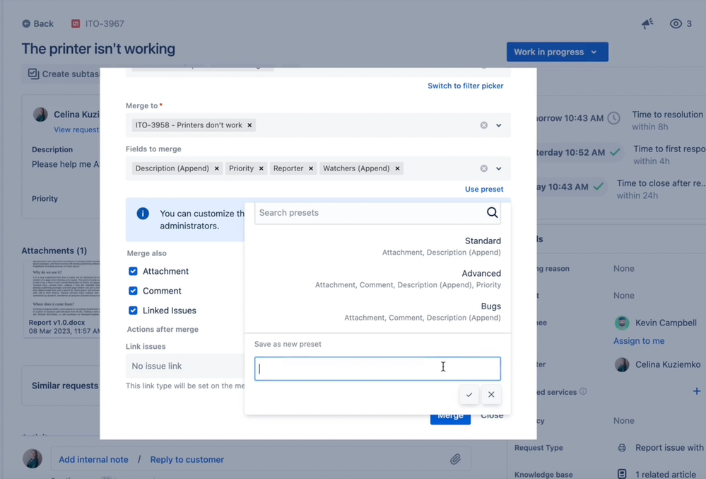 Create a ready-to-use preset – choose which fields you need to merge and save those settings as preset. Use it later, when you need it. It’s really convenient. I have many presets with different names and it’s super quick to merge issues manually.