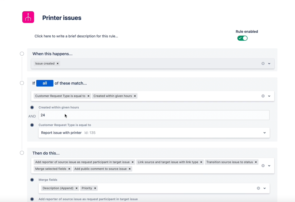 My favorite one. Imagine that we have a global crash and tickets about bugs are coming and coming. You can create an auto-merge rule and be sure that tickets will be automatically merged. Create a rule once, and then all tickets about the same case will be merged. Of course you will be informed what was merged with which tasks.