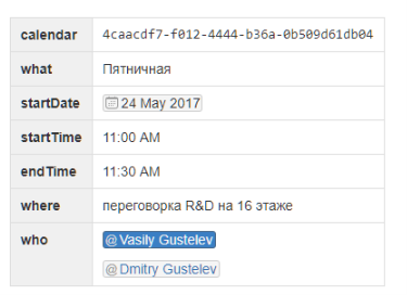 console.log(calendar+" "+startDate+" "+startTime+" "+endTime+" "+where+" "+$persons);