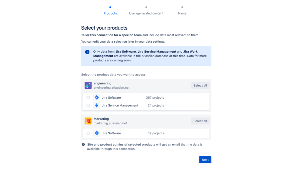 Previously, organization admins could only select which product instances were included in an Atlassian Data Lake connection. This meant that all projects on that instance were automatically included. By popular demand, we've updated the Atlassian Data Lake connection process to include a step that allows users to select the projects that they want to be brought into Atlassian Analytics.