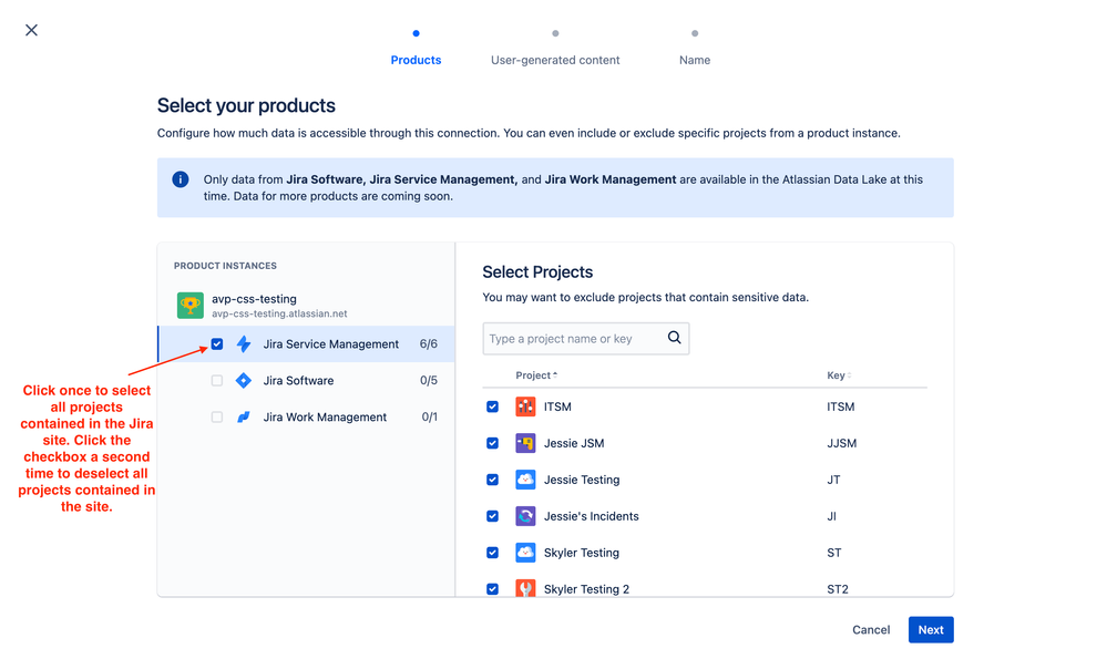 Effective this week, any new Atlassian Data Lake connections created in Atlassian Analytics will take you through the Select Projects screen. Here you'll have the option to either select specific projects from your product instances or all projects from those instances. We think that this change is going to have a strong positive impact, as some users have expressed the need to be able to exclude or include specific projects for security, privacy, or other reasons. We hope that you’re just as excited about this update as we are, and we look forward to hearing your ideas and feedback. Thank you!
