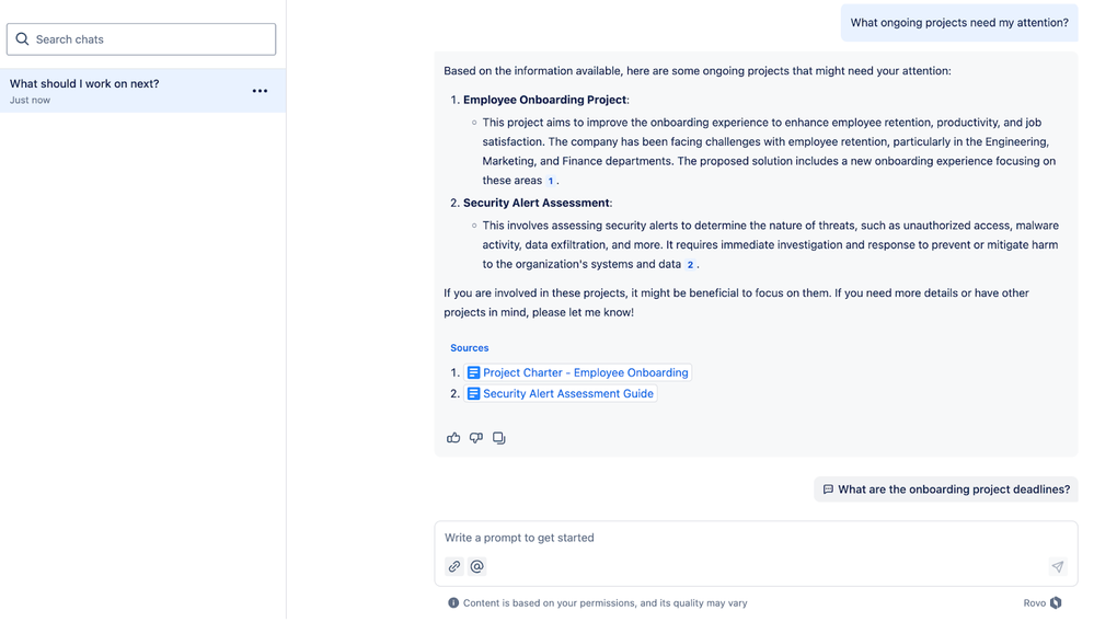 Rovo is built with the Teamwork Graph (TWG) in mind—it is Atlassian’s secret ingredient! It is a powerful tool that maps team relationships and interactions, enabling enhanced collaboration, productivity, and data-driven decision-making. Rovo leverages TWG to deliver richer, customized chat responses and empower its agents with precise, personalized actions based on your organization’s unique knowledge. This makes Rovo’s AI-powered assistants more effective in automating workflows and streamlining tasks tailored to your team’s context.