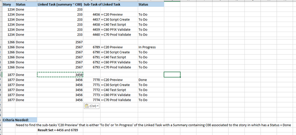 The story has a linked Jira Type Task - that Task has sub-tasks... Attempting to find a specific sub-task with a specific state of the task linked to a specific story.