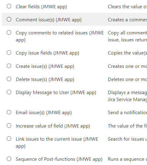 JMWE also has some more extensive abilities. You also have the functionality to run shared actions. Using this post function allows you to reuse the same setup over multiple transitions within a workflow or multiple workflows, all while having a single item to maintain. This can greatly reduce the time it takes to make updates and can make every admin happier.