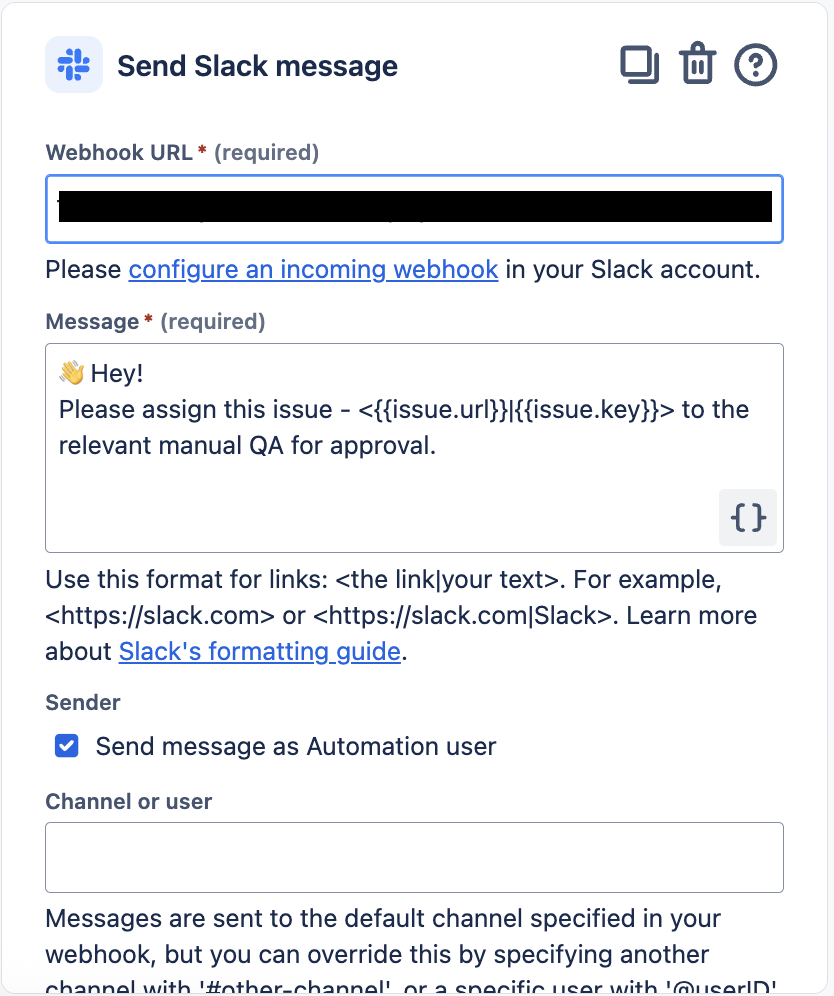 For that to work, the Slack ID values must be captured from Slack and stored in Jira, such as with user entity properties. Once set up, this makes it easy to mention them in the Slack message, such as with: