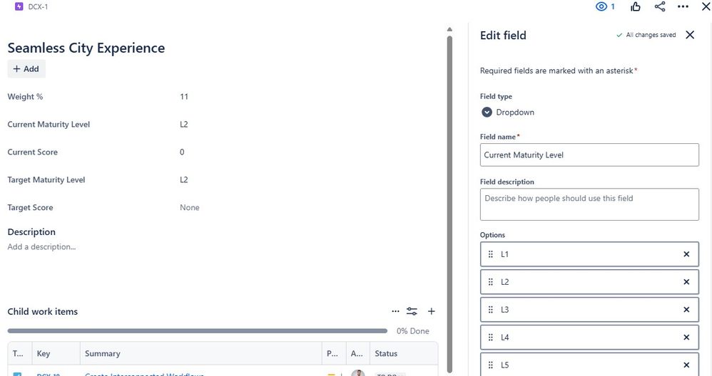 {{issue."Weight %".toNumber.default(0)}} * {{if(issue."Current Maturity Level".value.equals("L1"), 1, if(issue."Current Maturity Level".value.equals("L2"), 2, if(issue."Current Maturity Level".value.equals("L3"), 3, if(issue."Current Maturity Level".value.equals("L4"), 4, if(issue."Current Maturity Level".value.equals("L5"), 5, 0)))))}} / 5{{issue."Weight %".toNumber.default(0)}} * {{if(issue."Target Maturity Level".value.equals("L1"), 1, if(issue."Target Maturity Level".value.equals("L2"), 2, if(issue."Target Maturity Level".value.equals("L3"), 3, if(issue."Target Maturity Level".value.equals("L4"), 4, if(issue."Target Maturity Level".value.equals("L5"), 5, 0)))))}} / 5