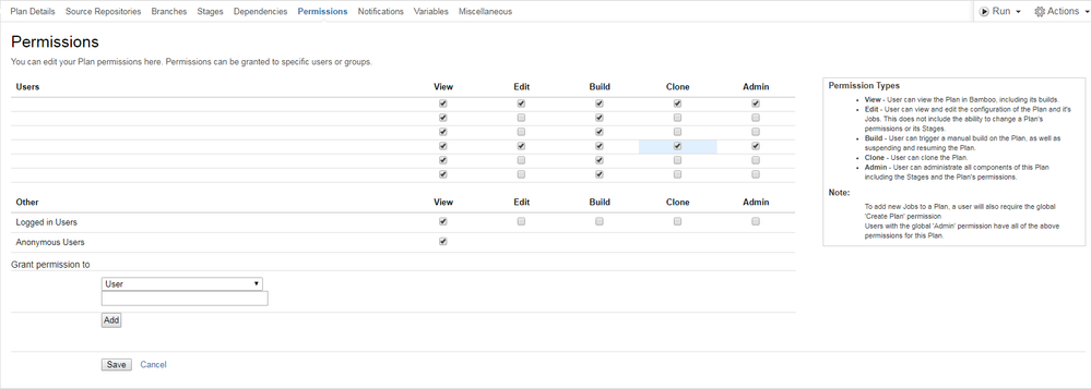 On the build plan Permissions page on Bamboo, I can't see the users that were granted permissions. There are a few rows, but the user name fields are blank (I attached a picture below). How can I fix this? Thanks!