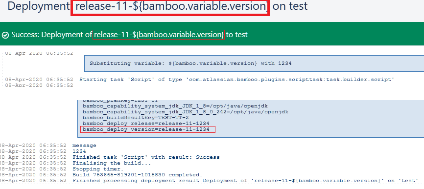 Hello everyone. I'am trying to set deployment version from my custom variable. I see on the log that, the bamboo.deploy.version variable has been set as I need (using my custom value), but label is presentig different value.