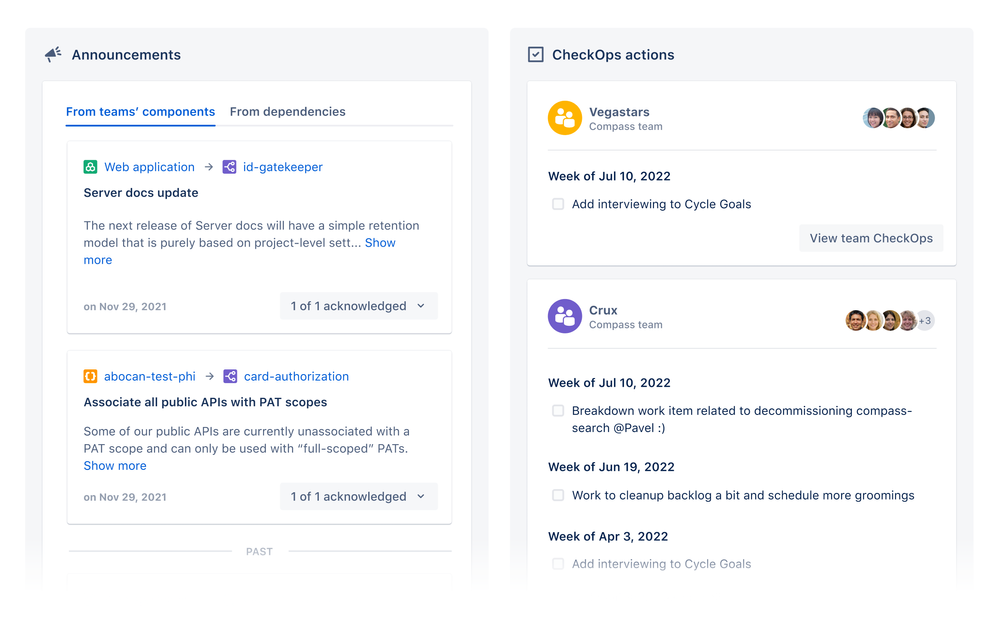 Start your day with clarity the moment you land on your Compass homepage with CheckOps and announcements. CheckOps is a team ritual that unites engineering data with continuous improvement, empowering you to turn insights into tangible actions that are tracked on your homepage. Paired with announcements that keep you informed of any changes on upstream dependencies, you’ll start each day knowing exactly what needs your valuable attention. Learn more and tell us what you think.