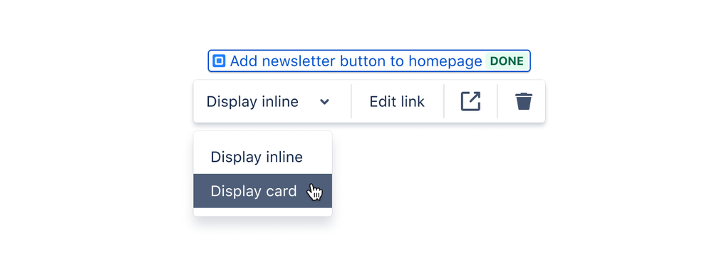 To add an Azure DevOps Smart Link, simply paste the URL link on a Confluence page or type “/link” to insert. Once pasted, you can view the file as a small “inline” link which quickly tells you the link is for an Azure DevOps epic Work Item. In this example, the Work Item is named “Add newsletter button to homepage”.