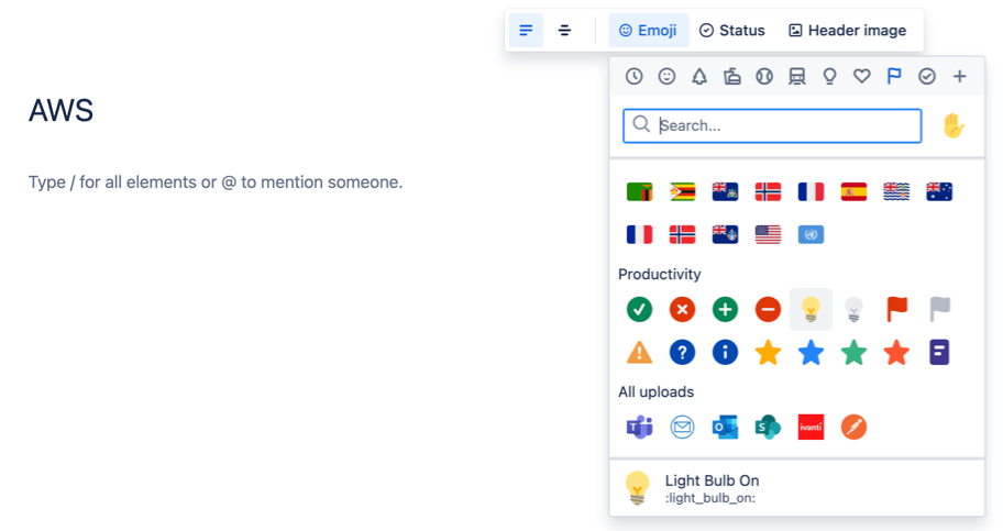 I am trying to create and add own emojis to Confluence Page Title, but it seems it is not available for the title. I am trying to use the AWS, Athena, Redshift / Splunk and other symbol image to create custom emojis and want to add that to page title, to indicate that this page and all it subpages are related to AWS or Athena and so on. Why can't I add it to Title, if I am able to add the custom emojis to the page?
