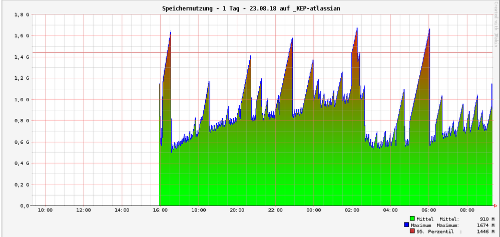 I installed Javamelody and got the following results. I had to increase memory to 2 GB to cover the memory peaks.screen memory 180823.pngThere has to be a problem with memory consumtion.