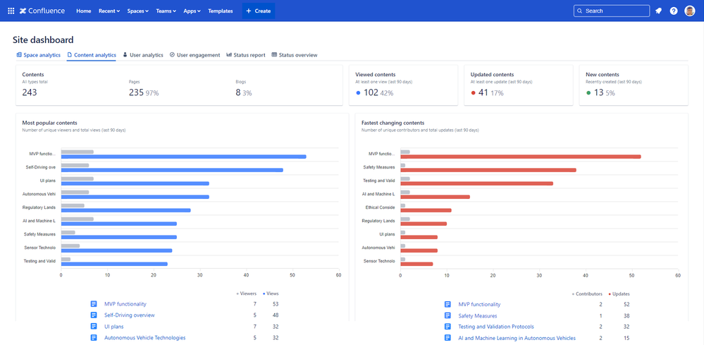 See the Content Analytics dashboard for the whole site (or for a single space):