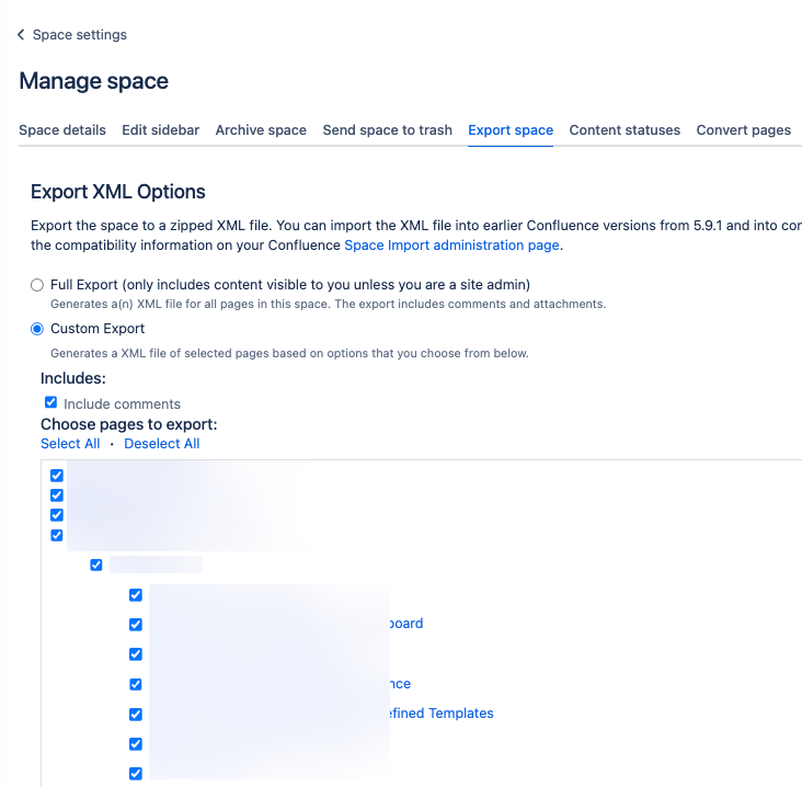 - Yoour use case is to import a space into another Confluence site (I assume cloud), so CSV is the best option